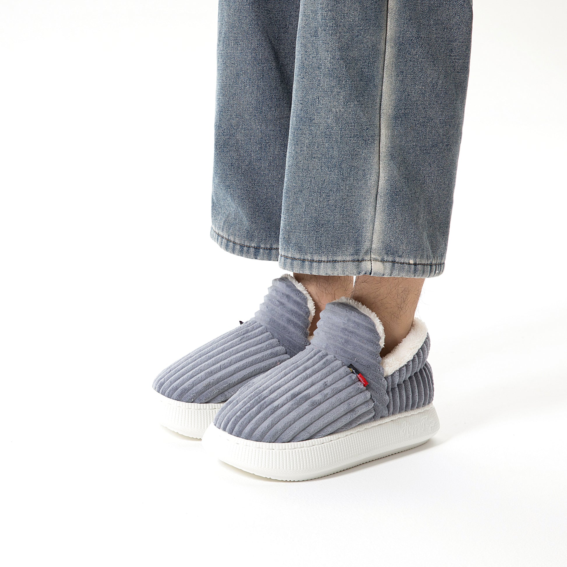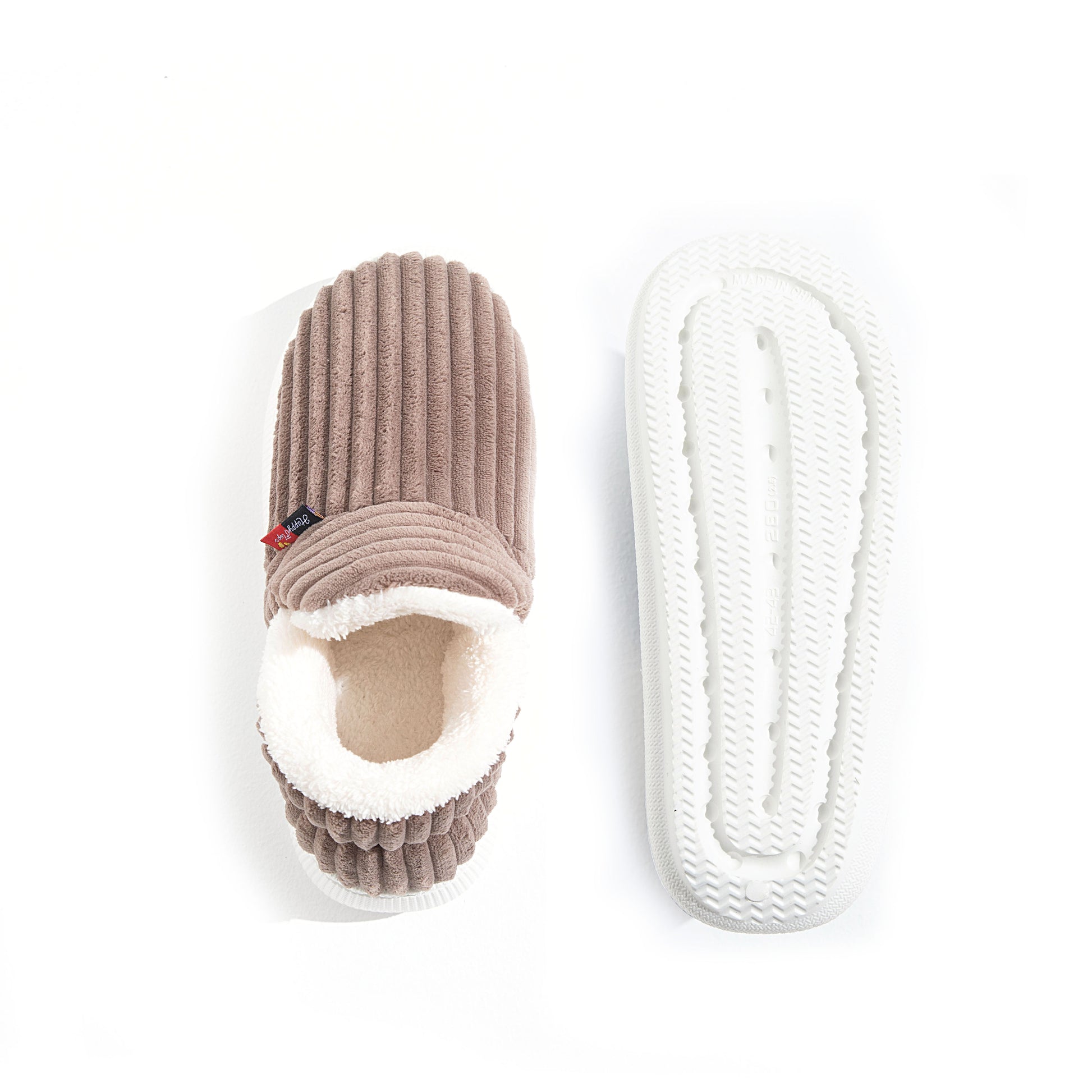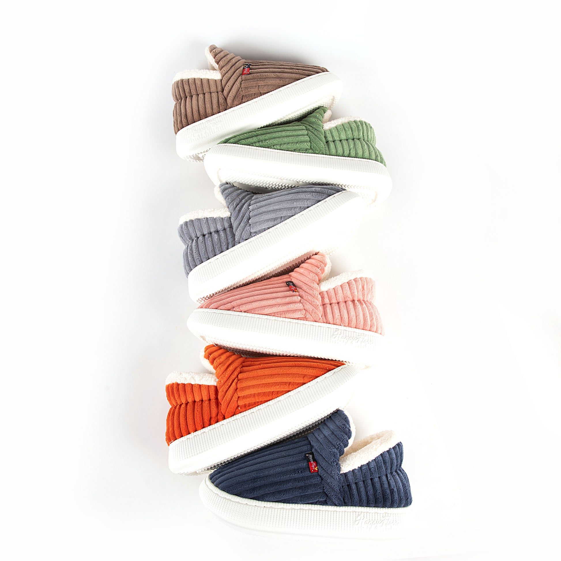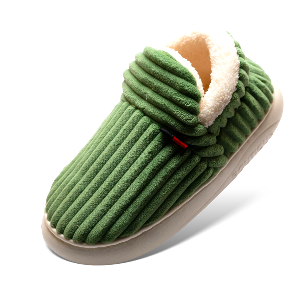 HappyCozy je vyrobený z vegánskeho plyšového kožúška a udržateľného materiálu EVA, ktorý spája teplo a podporné pohodlie pre vaše nohy.