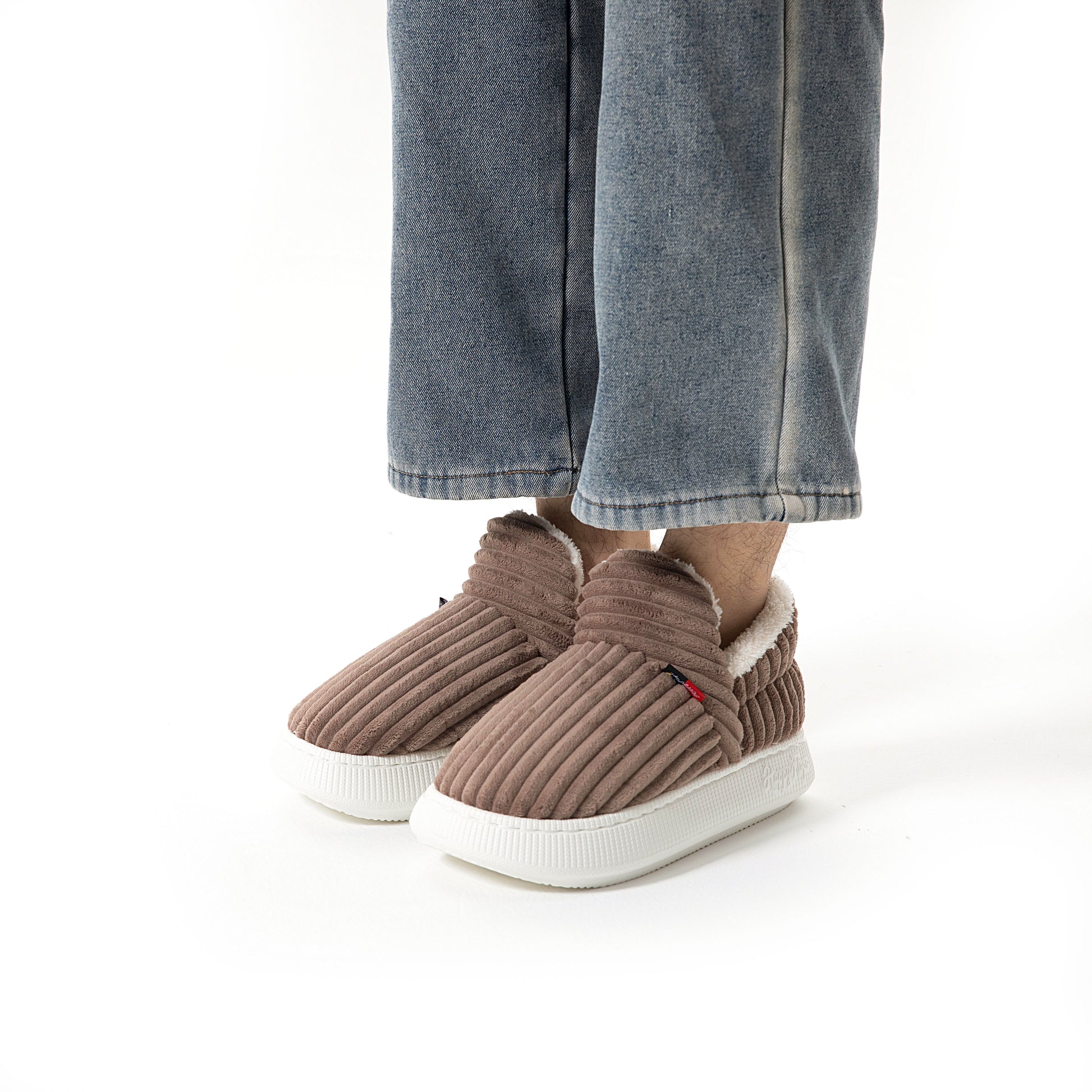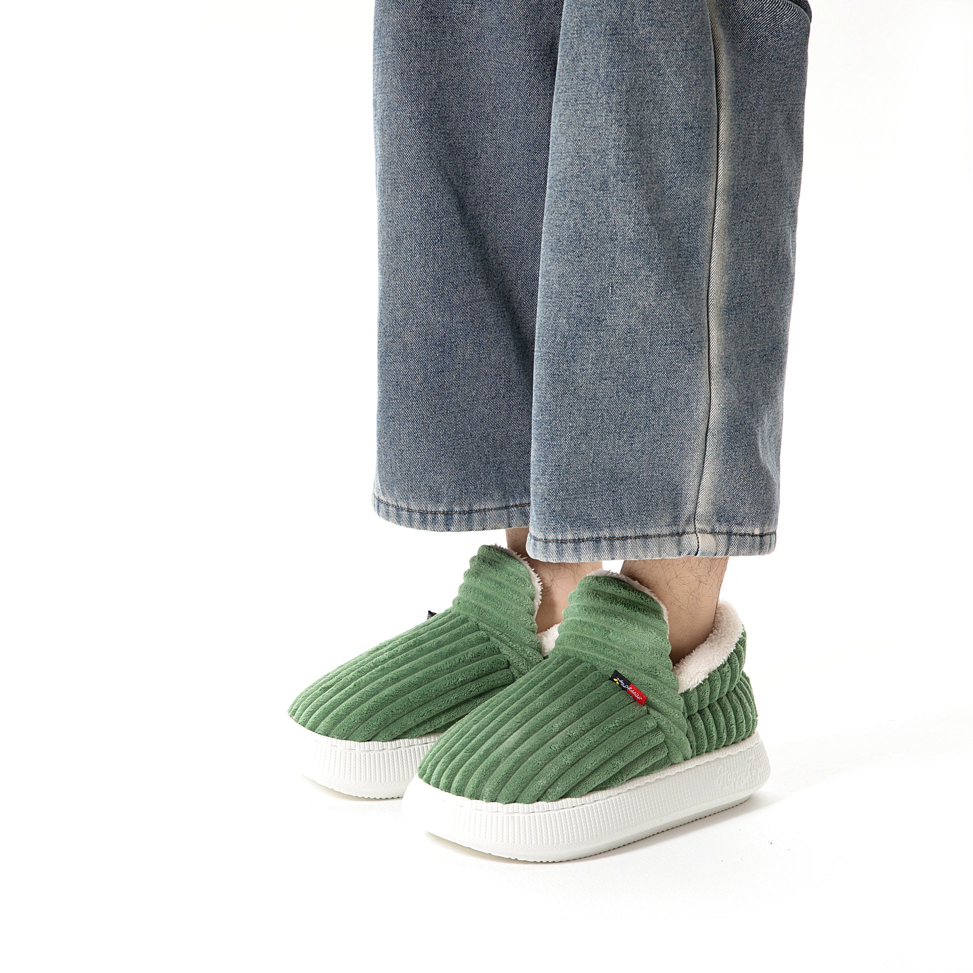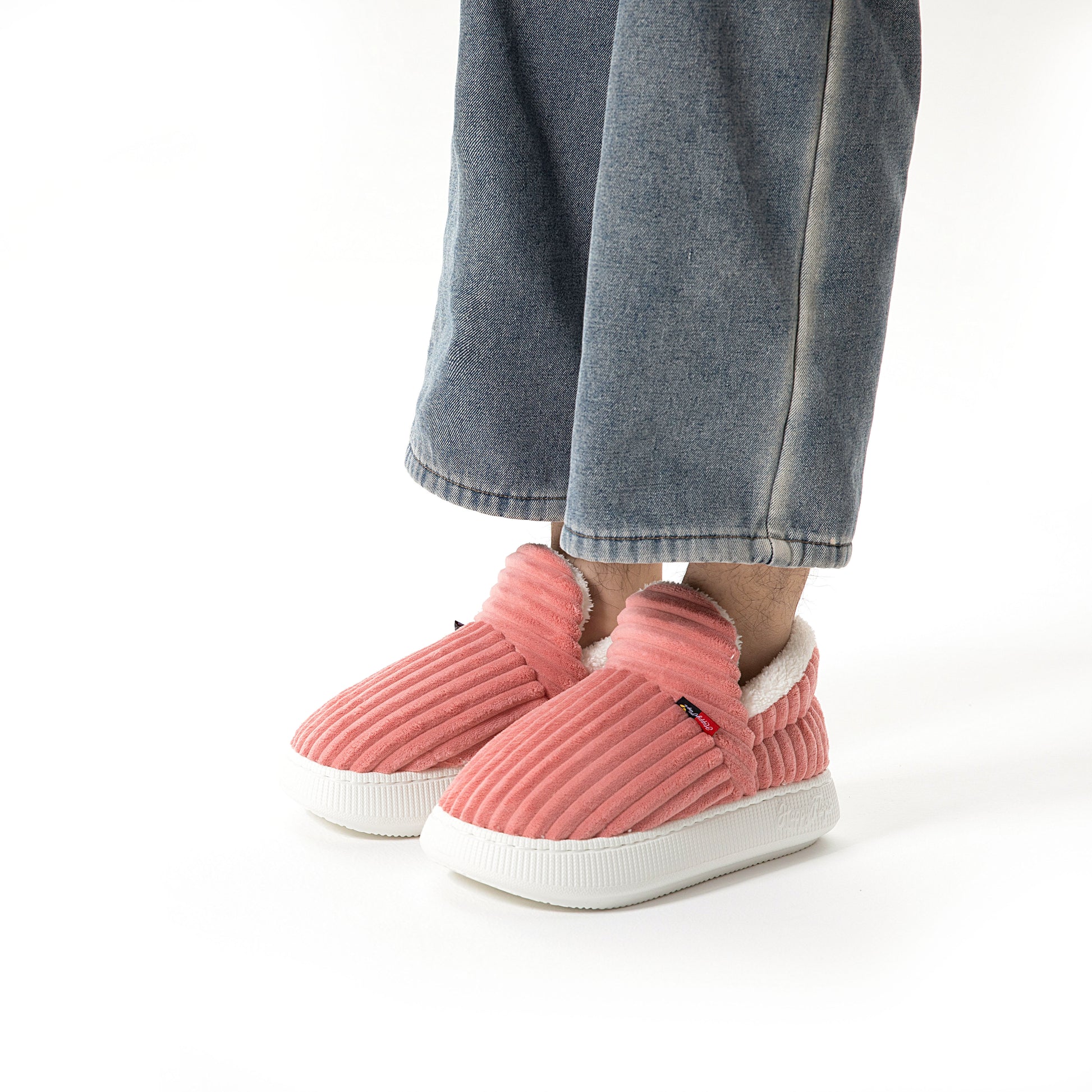 HappyCozy je vyrobený z vegánskeho plyšového kožúška a udržateľného materiálu EVA, ktorý spája teplo a podporné pohodlie pre vaše nohy.